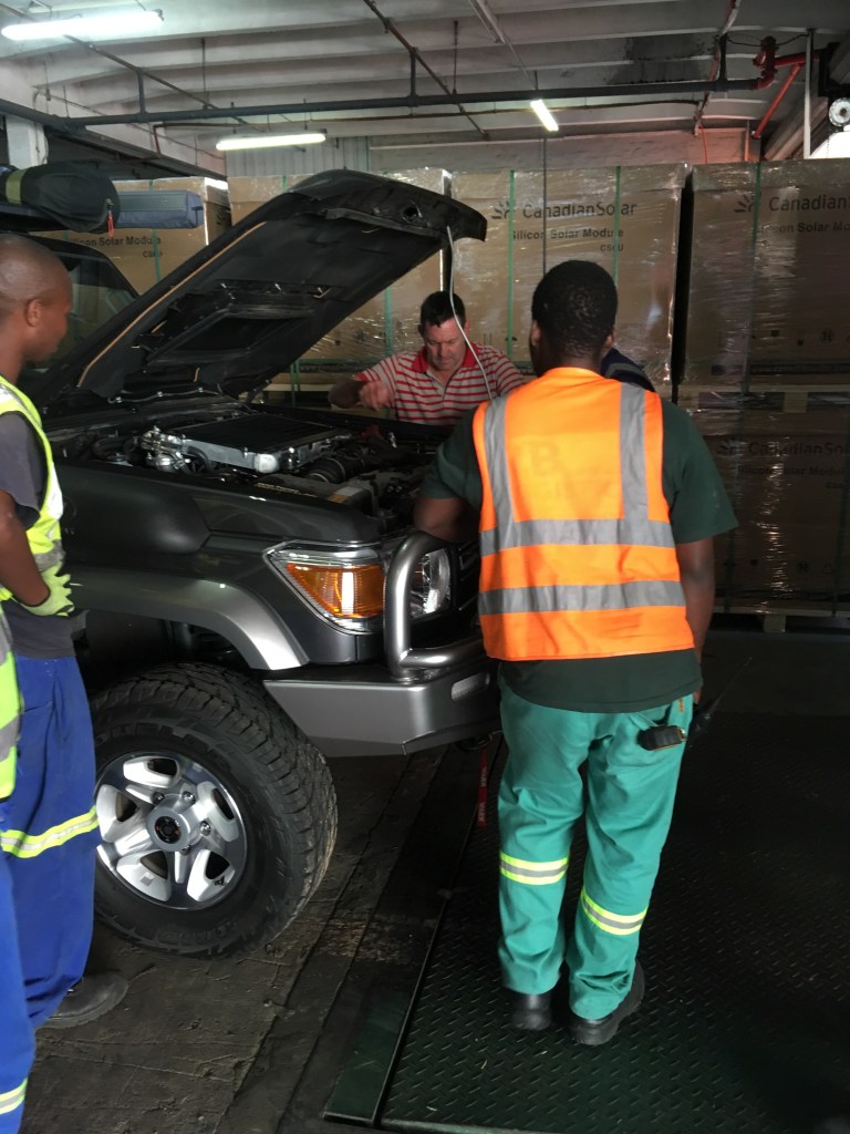 So after 57 long days our vehicles were released to us in Durban. They arrived in South Africa on the ship The Rosa on the 11th of June but sat at anchor outside Durban for two days before coming in on the 13th. Then it was until the 20th of June before we were able to get our hands on them!๐. On the way to the warehouse to pick them up we had a phone call from the shipping agent telling us that there had been a second Customs inspection and the charge would be 3500 Rand ($350)๐ณ…..Ok we said no problems, we just want our vehicles. On arrival Anthony the Logistics Manager let us know that the container still had the original seal on it which was put on in Melbourne so we are still unsure how Customs managed to do their inspection! Not only that but the rear of the Landcruiser and Kimberley were locked up like Fort Knox!