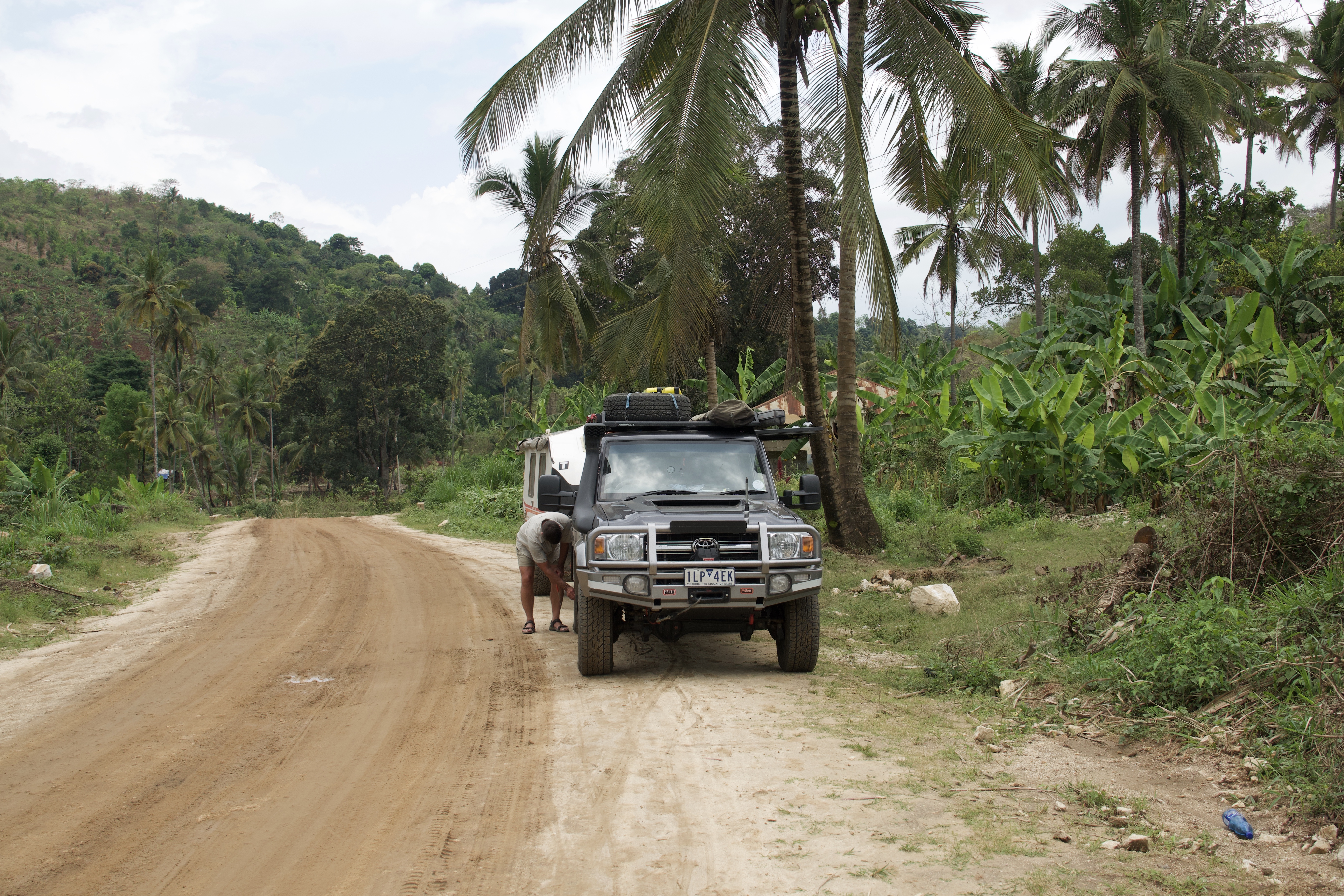 That night we got to a great little lodge called TanSwiss which is named that because the owner is a Swiss man in Tanzania! It was like a little oasis and had a nice quiet camp area but also boasted a terrific swimming pool which we used as soon as we had set up. The next morning it was my turn for the stomach cramps and so we made the decision to stay an extra night before moving on. In the afternoon I was feeling well enough to go for a walk around the village which serves as a stop off point for the truck drivers going through to Dar es Salaam and was really interesting to have a look at. From here we drove another 100 kilometres to Morogoro where as we were driving through a man pointed at our back passenger side wheel and shouted out “flat tyre” and at first I was sceptical because you hear of people using this to get you to stop. However after Pauline lent out the window to have a look, yes indeed we had a tyre loosing pressure so we pulled into a very conveniently located service station to change it. We had no sooner pulled in when about five men came up offering to change the wheel for us and they were so insistent that I ended up letting them do it. They had the job done in no time at all but at all times under my watchful eye to make sure the job was done properly! So how much did they ask for you might ask? The huge amount of 10,000 Tanzanian shillings which works out at $6 Australian and saved me a lot of effort and sweat on a very hot day! The service station had a tyre repair man set up in a corner of their property and he took it away to fix it straight away. The offending piece of metal was prised out and he decided that to be sure he would put a patch and a tube in. I was dubious about it really needing the tube but figured, better to be safe than sorry. This was the first puncture in Africa which is not bad considering we have done 24,000 kilometres on some pretty horrible roads, with a lot of debris on them.