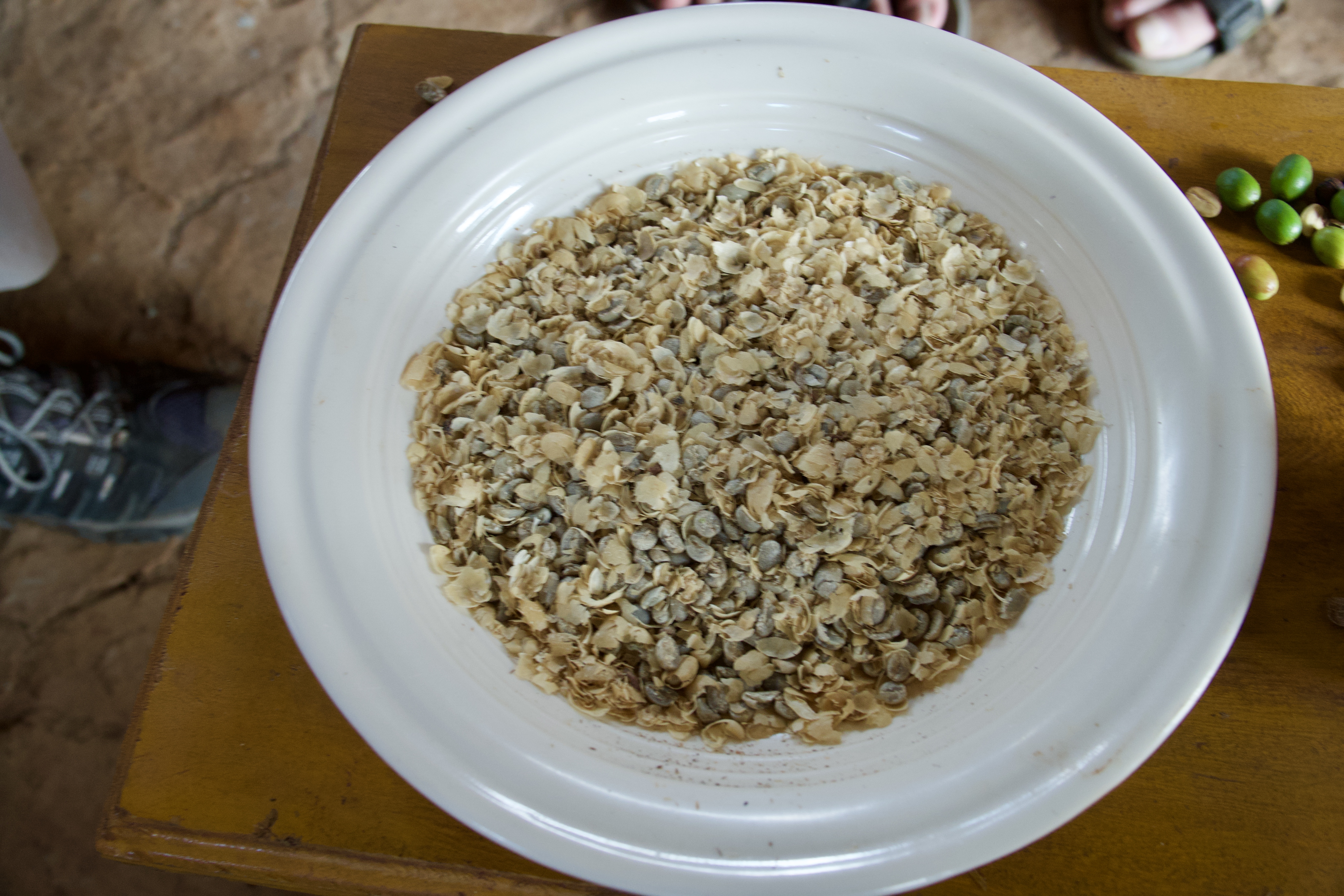 We then had a two hour break before our coffee farm tour so we found a good shady spot and just relaxed. Peter was proving to be an excellent guide, a great bloke to be with, had loads of energy and a great sense of humour. The walk to the coffee farm was only about three kilometres there and back and we were joined by Klaus, Hedwig and Eva which was great and again we walked through all the farms and family house plots to get there. These coffee farms are not big concerns but rather very small plots of 40 to 50 trees and the coffee dried green beans are sold to a cooperative who on sell them. Once there we went through the process of making our own coffee from scratch. This involved using a mortar and pestle to knock the husks off the already dried green beans and we all had a go at this, before winnowing the husks away from the beans using a gold panning method utilising the breeze. Pauline also found it useful to blow across the beans to do this! The beans were then put in a pan and roasted over a wood fire that was regulated by adding or taking away some bits of firewood. At this stage I was thinking that the coffee was going to be terrible and most likely bitter! We then tipped the roasted beans back into the mortar and pestle and all had a go at pulverising the roasted coffee beans and while we were busy doing that they had some water on the fire to boil. The ground coffee was then plunged straight into the boiling water which again set off the alarm bells. It was then served black and we all tried the coffee as it was before if we wished added some sugar. It was quite surprisingly outstanding coffee, strong but with not a hint of bitterness in fact it was very smooth. I laughed though when Peter took his coffee and promptly added two heaped dessert spoonfuls of sugar to it! We all bought some coffee to take away with us and Pauline and I bought two bags of 500 gram ground coffee because we always stop on the road at 10.30am for a coffee and we thought this would be perfect. Being a bit of a doubting Thomas though I figured that the coffee we bought would probably not measure up to what we had just made but I’m happy to say that it’s just as good.