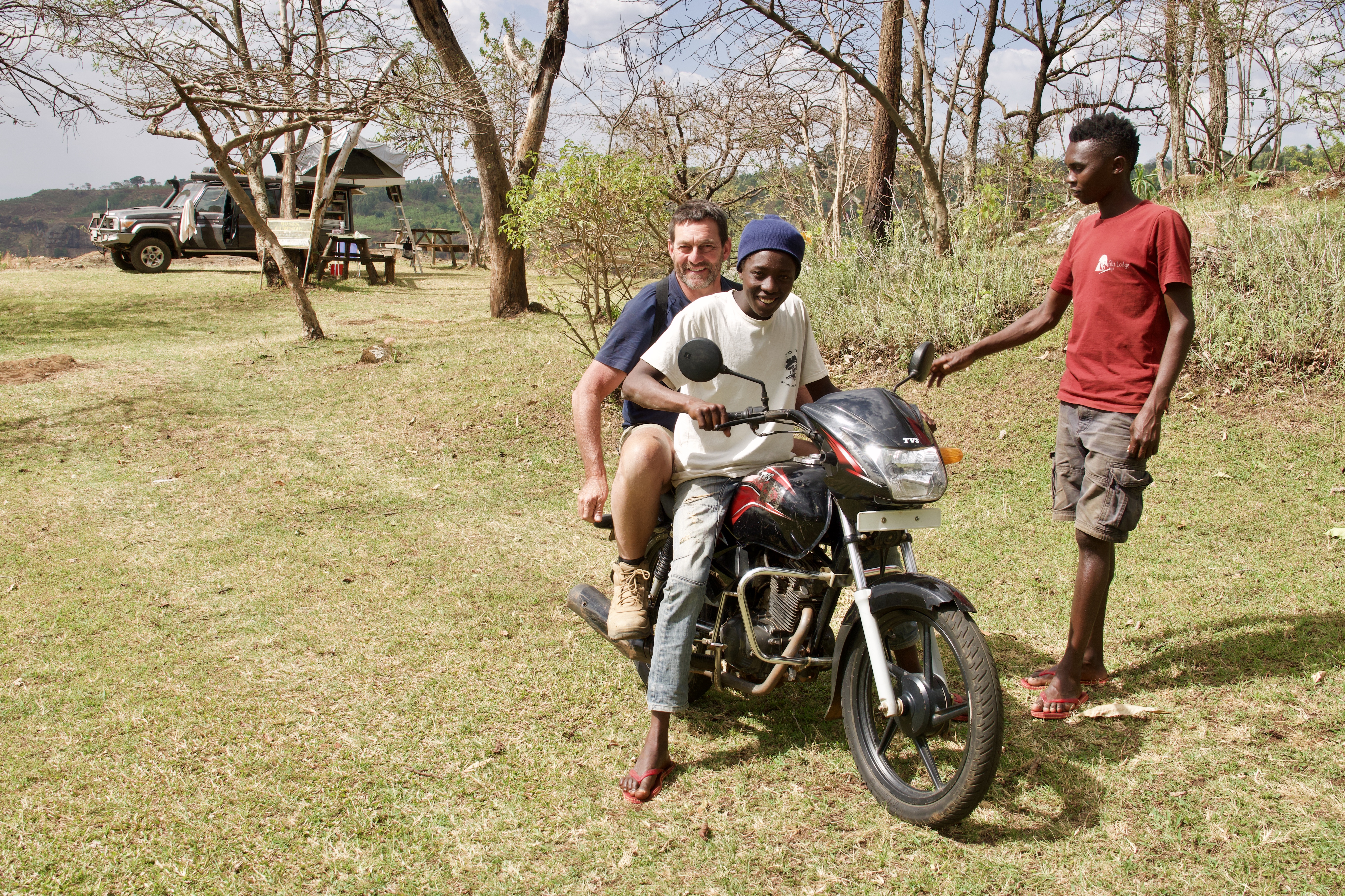 After entering Uganda we had a slow very steep track that wound up and around the Mount Elgon National Park which took us around eight hours to travel 137 kilometres. There is no wonder that the Suam border crossing that we used between Kenya and Uganda is not very well used because it is little more than a track on the Uganda side. It was very heavily populated and a hive of activity with the locals trying to get the paddocks ready for planting because from March onwards they expect the rains. Our first stop in Uganda was at the Sipi Falls and according to our app iOverlander the camp with the best view was Mose’s Camp so we headed straight for there. The camp looks directly over the lower falls and also out over a vast plain to the West so we had spectacular views. It is a very basic camp with smelly drop loos and cold showers in a bucket hanging from a pole but that’s Africa baby! The restaurant/bar were very basic too with no power so no cold beer and wood fires to cook on, so if you wanted cold beer they would run up the road to get it for you. None the less the family who ran the camp were very friendly and we ended up loving our three nights in their camp. We were the only ones at the camp so once we got ourselves set up I then I asked Peter who worked there where I could go to get a sim card for our phone and also an ATM for some cash. He promptly suggested that he take me on the Boda Boda (motorbike) and at first I thought heck do I want to put my life in his hands because after all we had seen the way they ride and no helmets or any other protection was also a concern! What the heck let’s go and true to form I was terrified by some of his overtaking manoeuvres but we made the 20 kilometres to the next big town and he guided me through the process of getting a sim card, then we got the cash and then amazingly returned in one piece! Peter also offered to guide us the next day on a walk up to the Sipi Falls and also on a coffee farm tour which we agreed to.