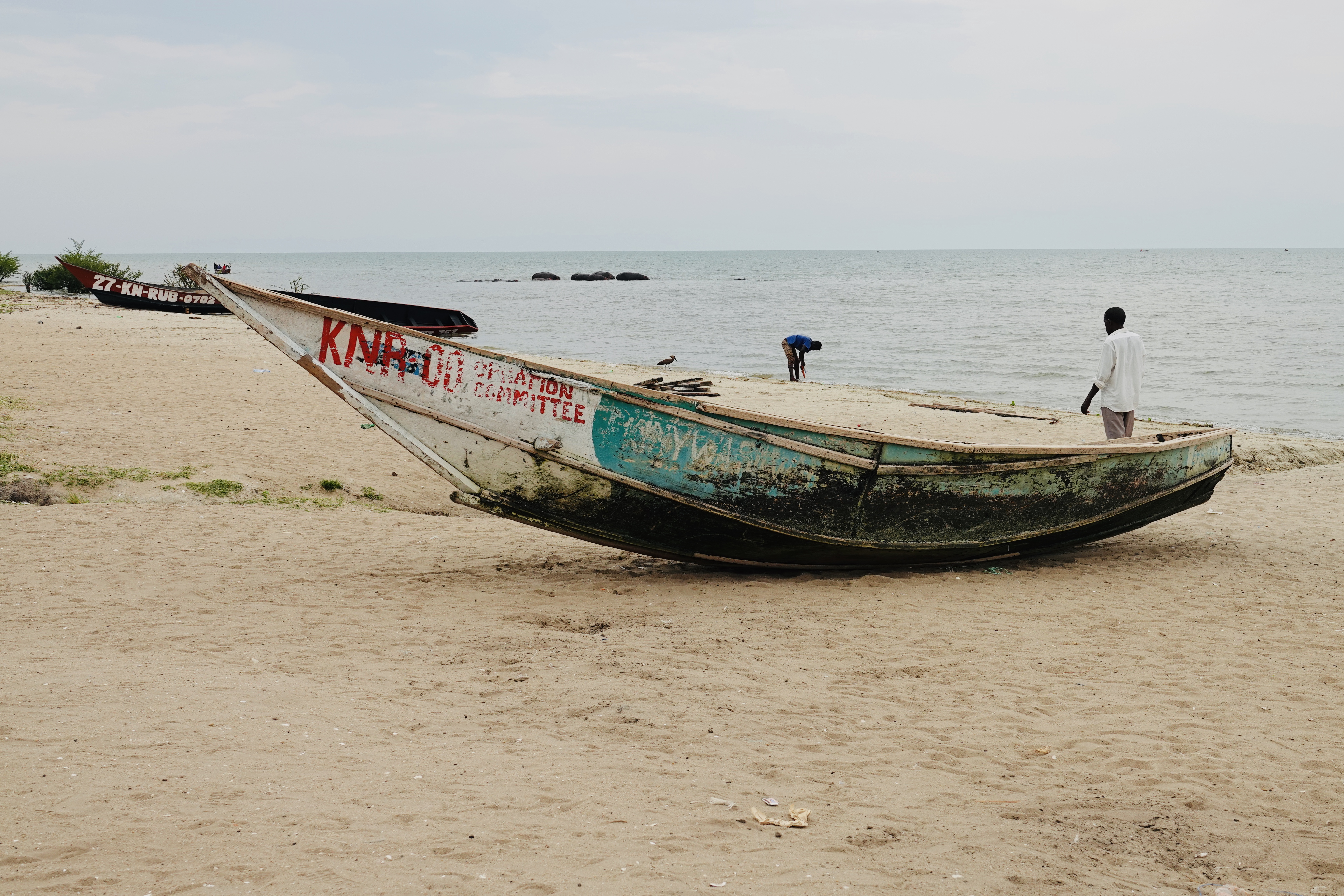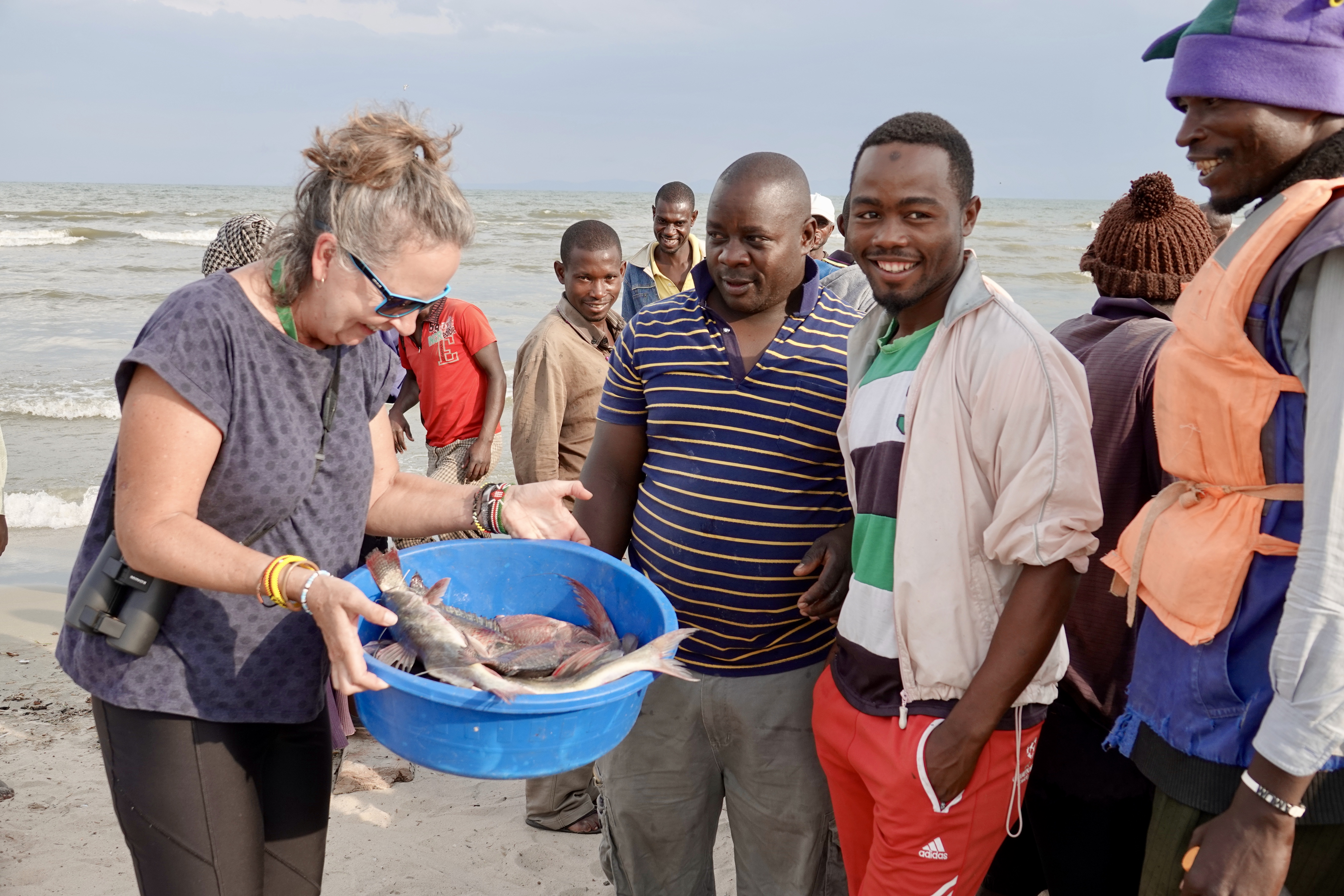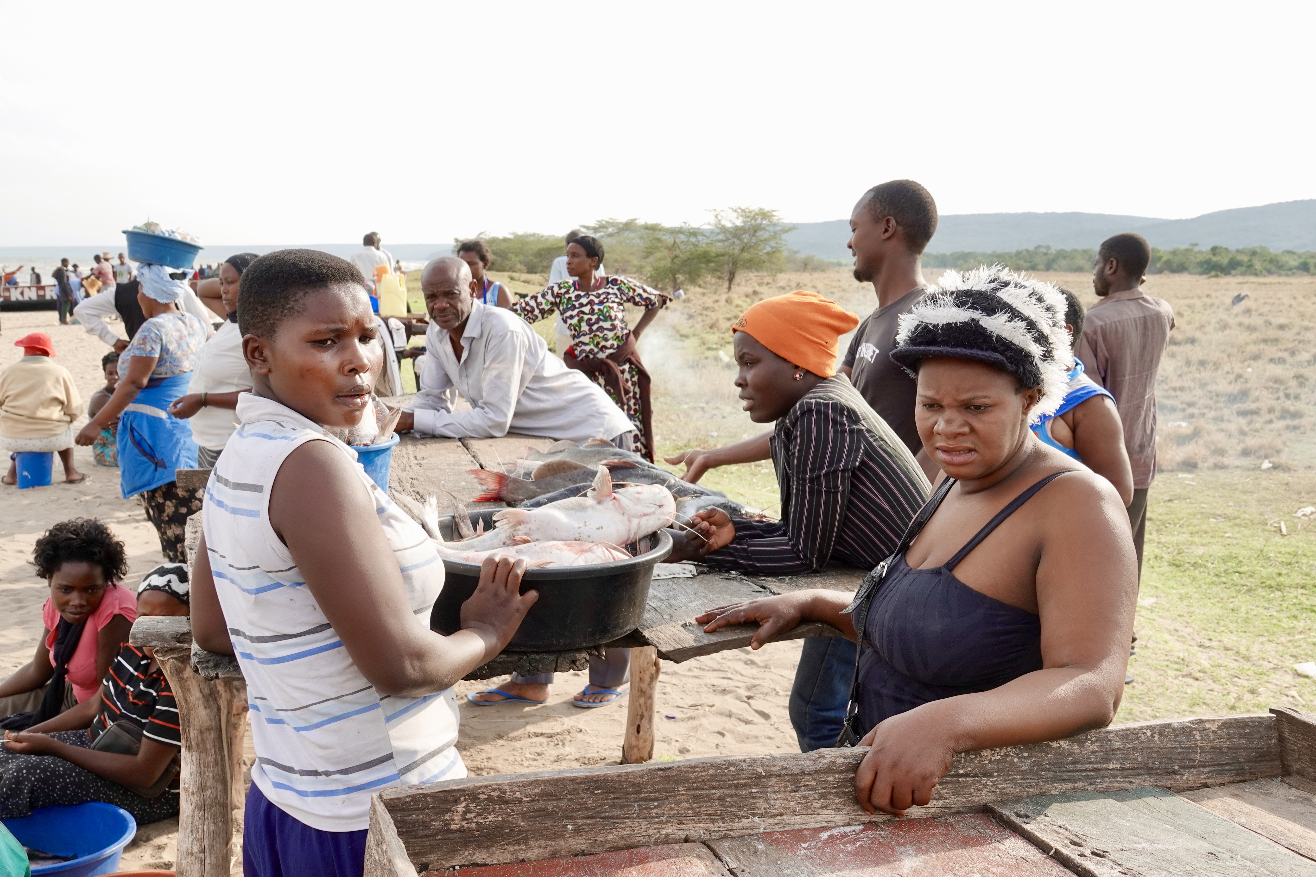 Then seeing that there was a lot of action going on down at the lake we decided to walk down and see for ourselves what was going on. Everyone was so friendly and I got talking to two men Steven and Foruk (spelling?) who told me that all the men were preparing to launch their boats to go out for a night of fishing. They leave at 3pm and go out into deep water to set their nets and then sleep in the boat until 3am when they pull the nets in and arrive back at the beach between 9am and 10 am. The government has reformed how things are done as there used to be a total of 120 small boats in this community but due to there size many men lost their lives due to rough weather that the boats were not capable of riding out and hippo attacks. So now there are only 40 larger boats licensed to fish which means that they are much safer but on the other hand many men have lost their income making the community really struggle because thatβs what they relied on.
