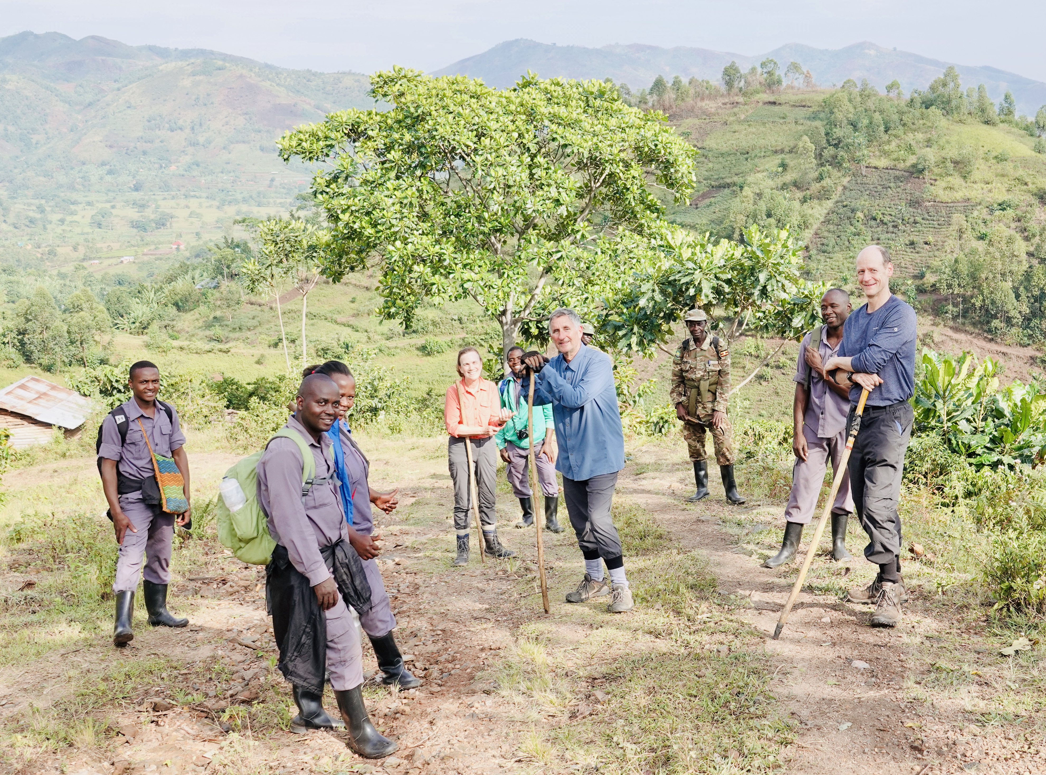 We were also given the option of a porter who would carry our backpacks (lunch, water and rain jackets) but would also assist if you needed it to push or pull you up the hills! We all took one because amongst other reasons it was good to give these community members a job for the day. We set off first in our vehicles to a point where we could go no further and then the trek started in earnest with a long steep climb! It was very steep and uneven climbing right to the top of a tall mountain before descending into a valley of rainforest where we eventually met the trackers, who then led us to the Gorillas. We first came upon two Black Backs who are males but not the Alpha male and they stay with the group but tend to keep out on the fringes not wanting to be confronted by the Silverback.