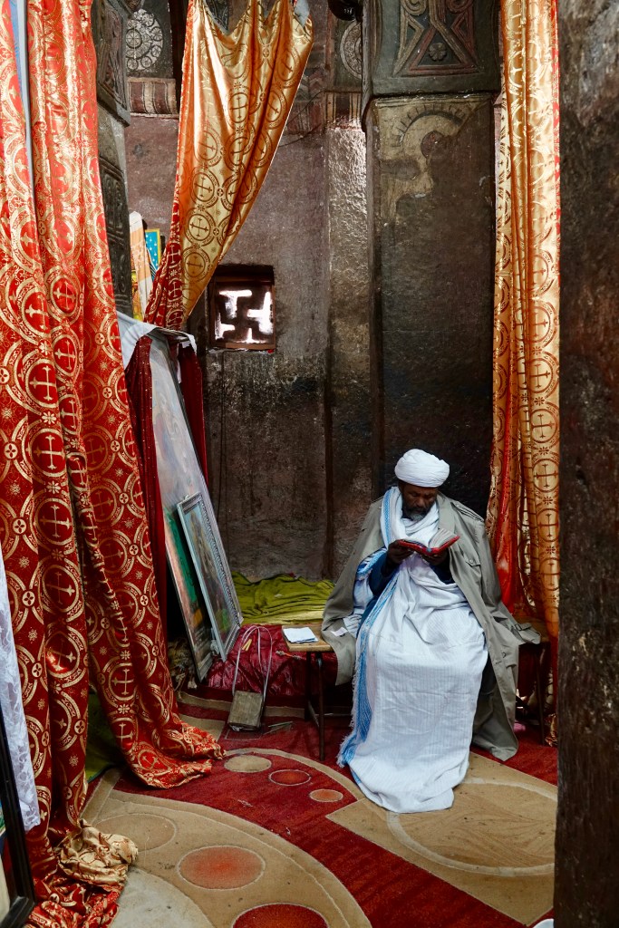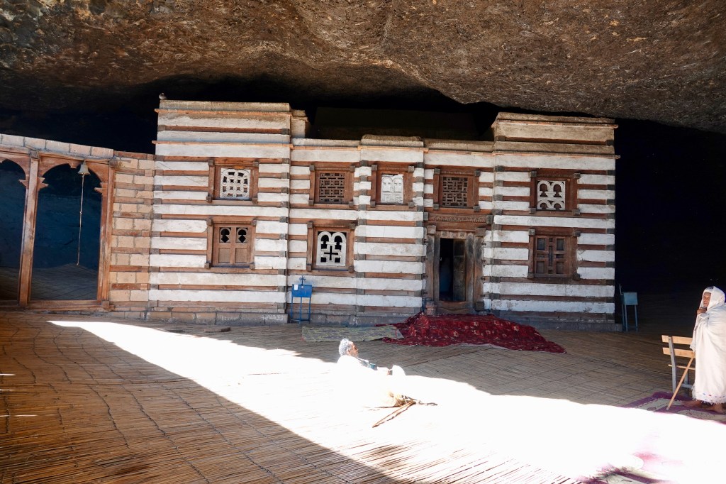 We rose early the next morning wanting to visit a church 42 kilometres north of Lalibela which was on the road we wanted to use to drive to Makele. Yemrehanna Kristos was built up to 80 years earlier than the Lalibela churches and not carved out of stone but built within a cave. The cave having a marshy soft floor the church is built on a floating floor of olive wood panels and the building is a made up of layers of rock and olive tree wood which is stunning to see.